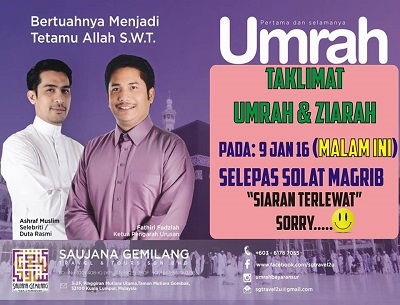Tarikh : 9 Januari 2016 Hari : Sabtu Masa : Selepas Maghrib Tempat : Masjid As-Solihin Felda Jengka 3 Oleh : Saujana Gemilang Travel & Tours Sdn. Bhd.
